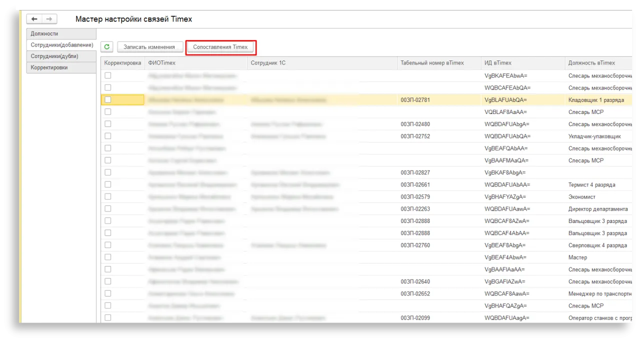 Если отметить в первой колонке «Корректировка» строки и записать изменения, то для всех помеченных строк, у которых указан Сотрудник 1С, будет добавлено сопоставление в регистр сведений для Timex.