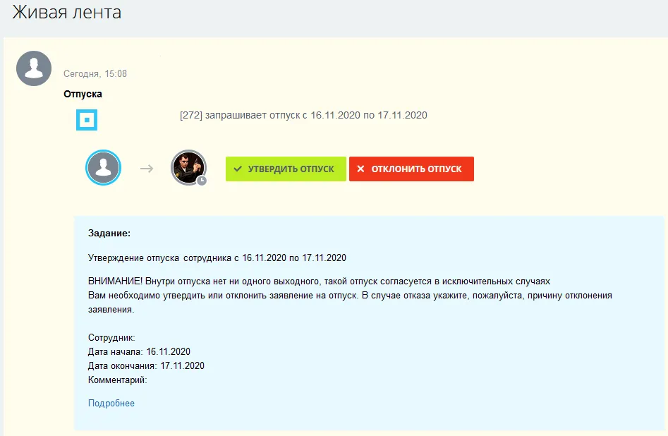 Когда сотрудник подаёт заявление на короткий отпуск за счёт работодателя, система также ставит на руководителя задание на утверждение, с пометкой о том, что отпуск не включает выходные и следует обратить на это внимание