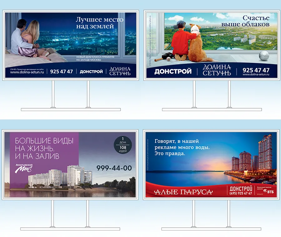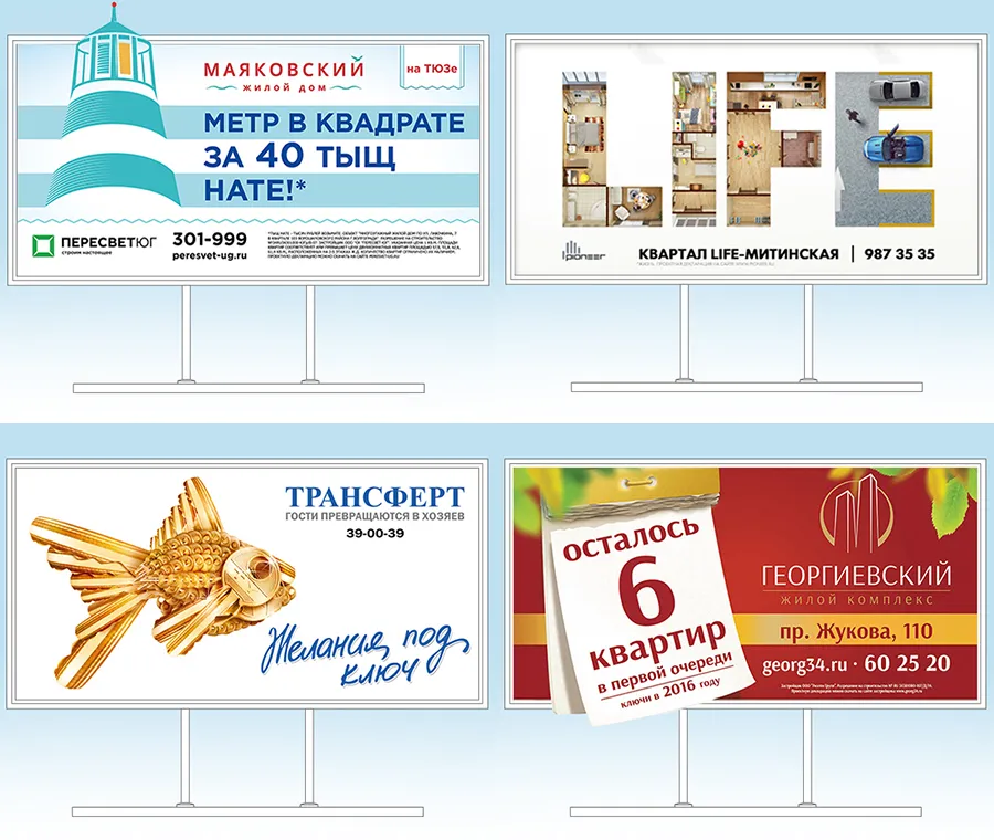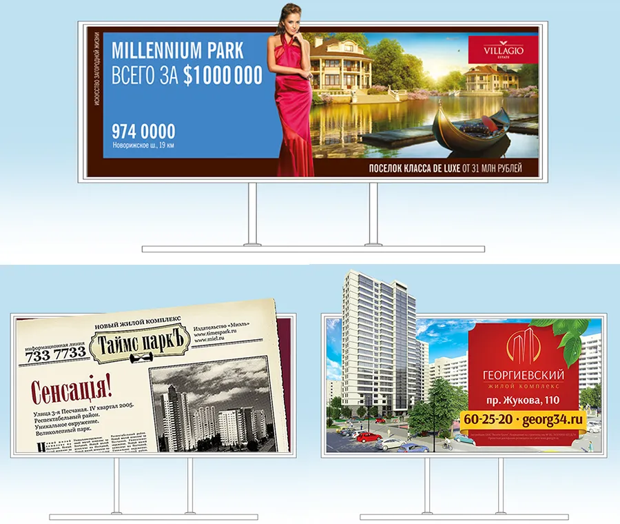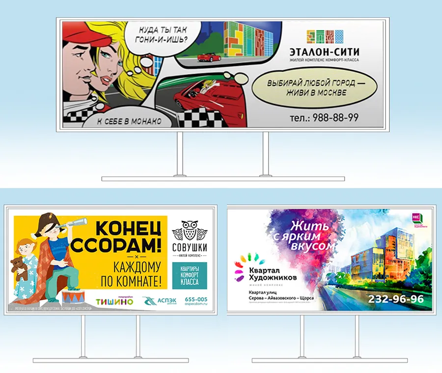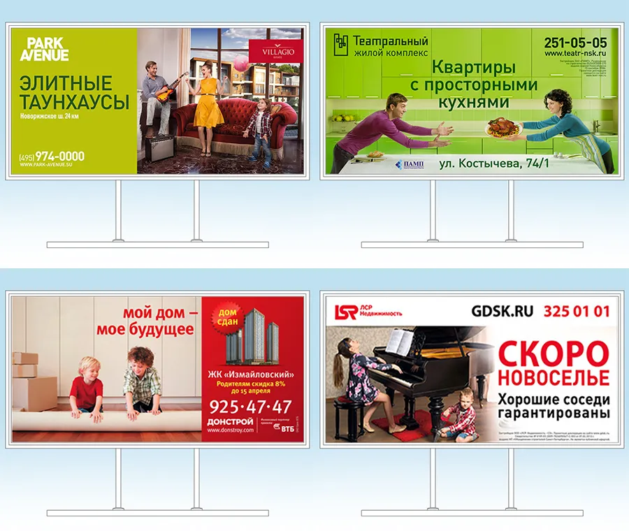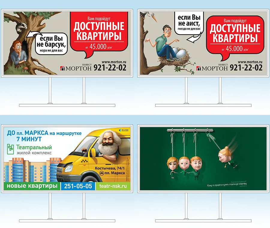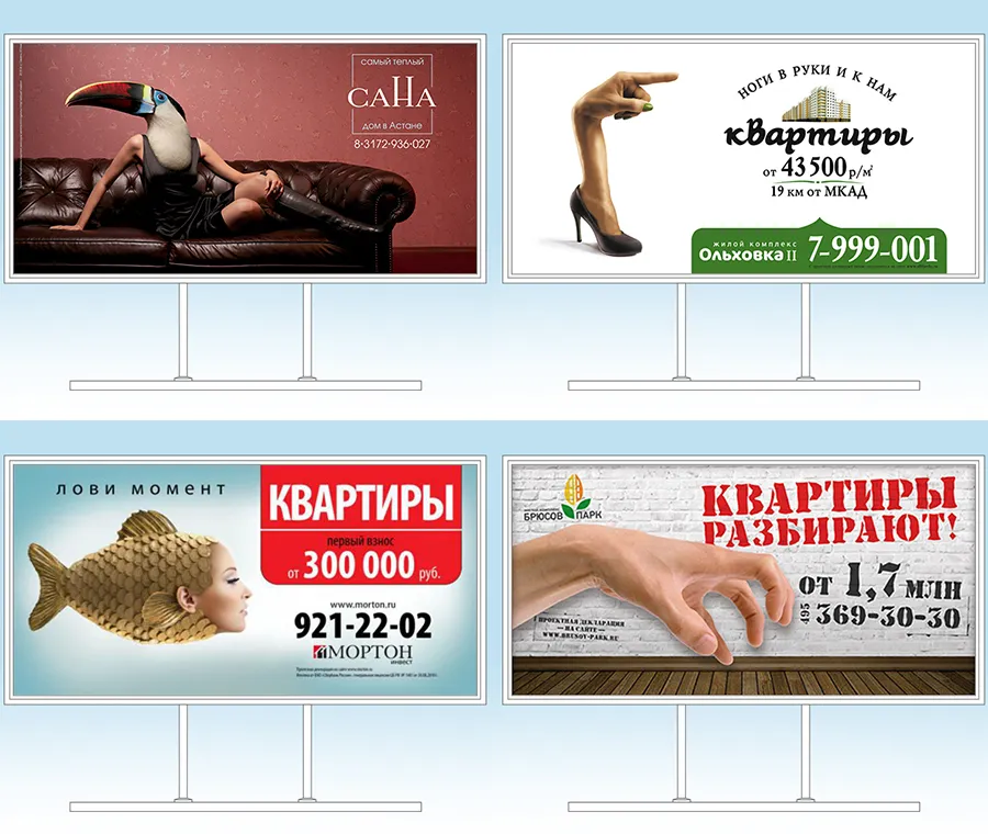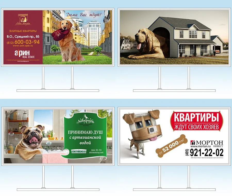 Все любят котиковИногда главными героями наружной рекламы недвижимости становятся домашние питомцы. Проследив за бешеной популярностью котиков в интернете, рекламодатели принялись размещать милых зверюшек на баннерах и щитах.