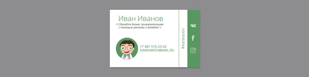 Если в макете есть значки социальных сетей, то нужно написать рядом название вашего профиля. Также можно указать хэштег по которому вас можно найти. Если имя на визитке с ним совпадает, то это не обязательно. Очень хорошо предварительно проверить самостоятельно, каким образом вас проще всего найти.