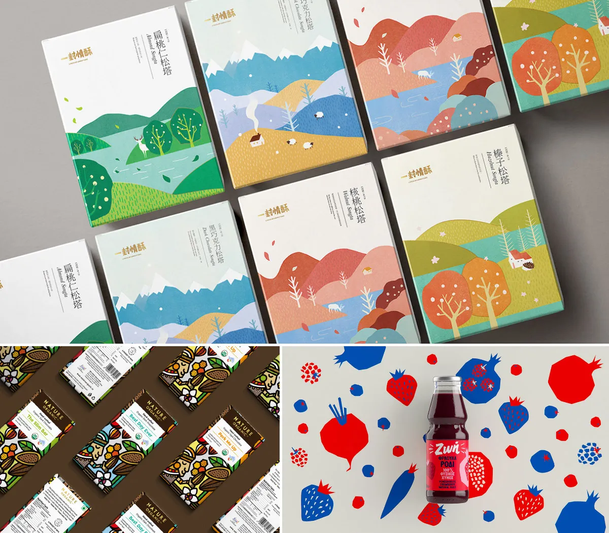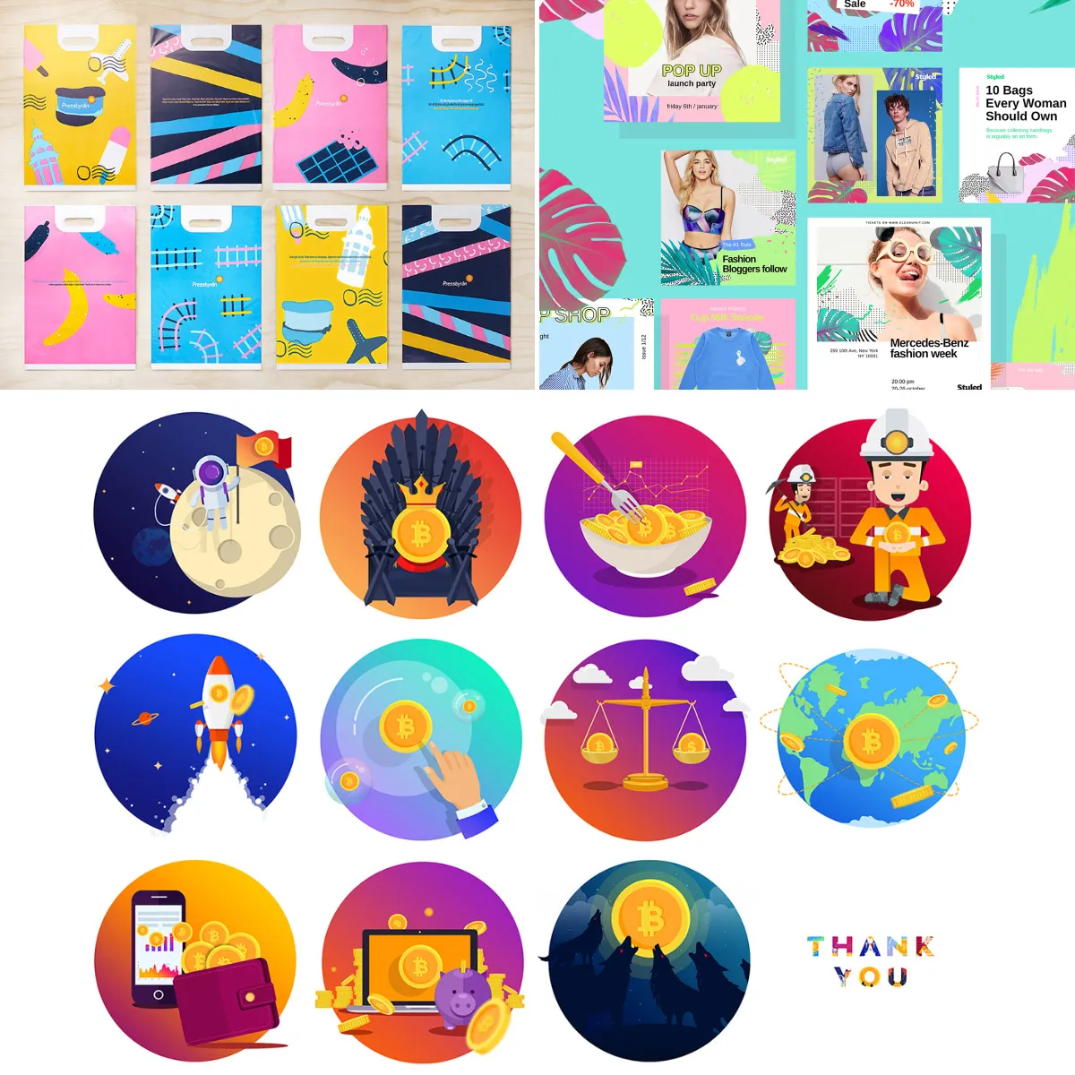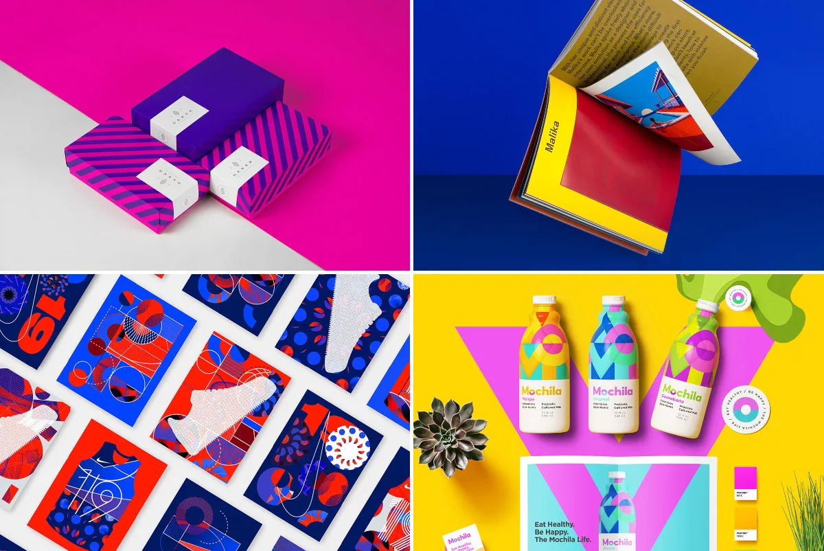11. Яркие многоцветные примитивные паттерны и иллюстрации (больше 3 цветов) + текст на плашках
