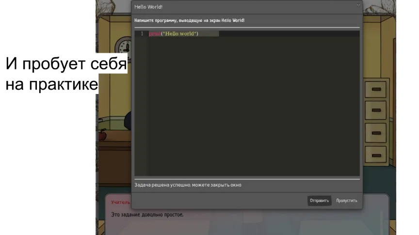 Вопросов у команды было немного, хорошие и самостоятельные разработчики. В 13.00 был готов движок — заготовка, уже есть часть сюжетов, взаимодействие между движком и бекендом. К 16.00 реализованы регистрация, авторизация, готово введение, бот, редактор кода. Урок — в процессе реализации.