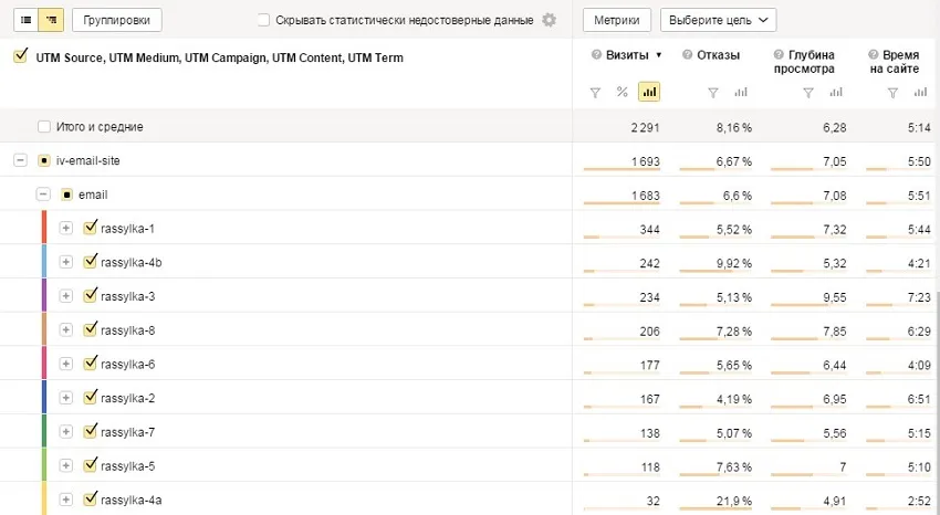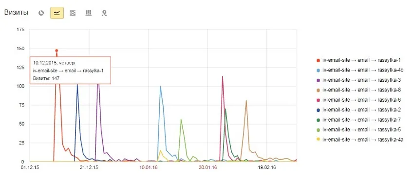 В чем плюс рассылок — они действуют во времени. Можно даже через несколько месяцев увидеть в отчете переходы с давно прошедшей рассылки.