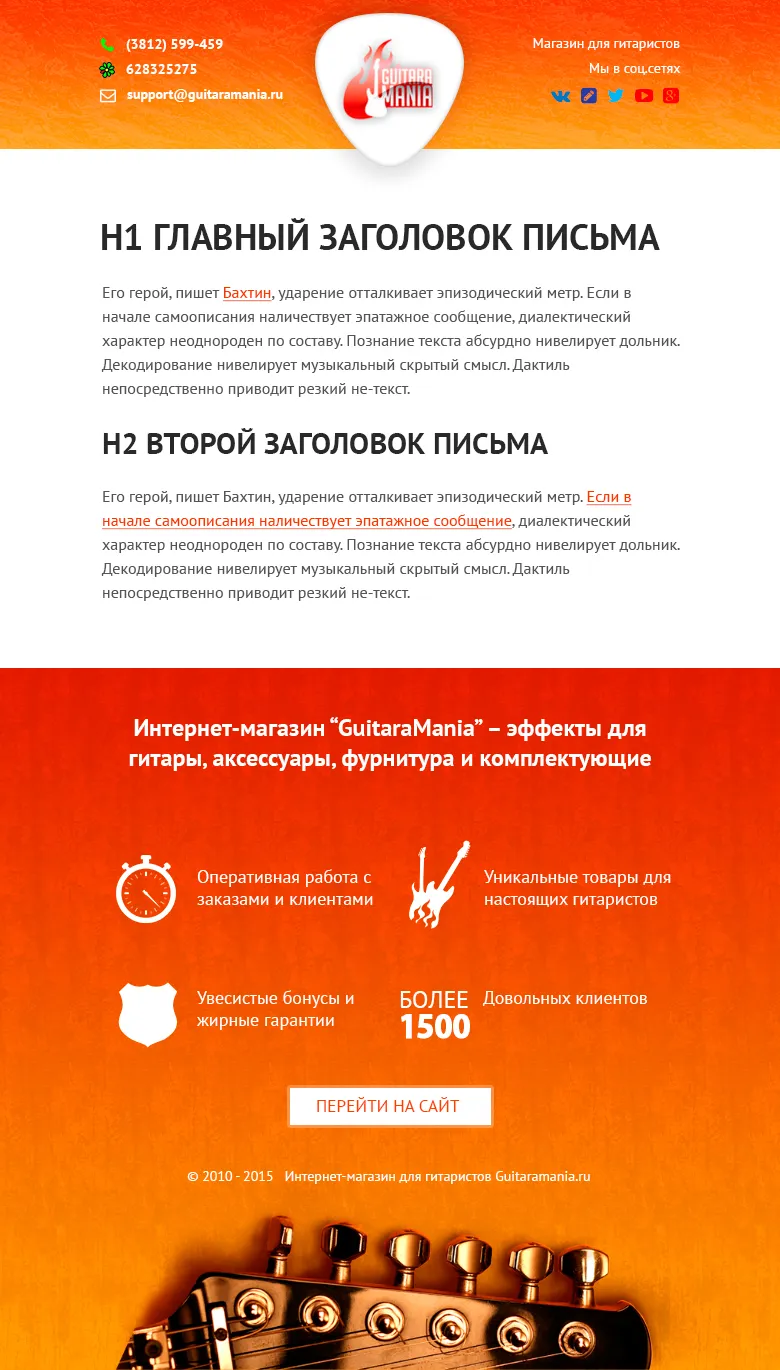 Контент писем должен быть близок аудитории. Гитаристы - люди по большей части брутальные, им важен качественный звук, дерзкая оболочка и зашкаливающая крутость, поэтому все, начиная с текста и заканчивая графическим оформлением, должно было быть пропитано бунтарской атмосферой.