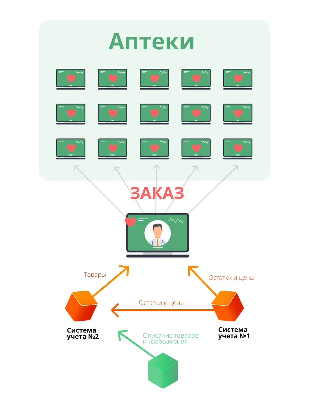 Каждый заказ отправляется сразу в конкретную торговую точку. В каждой аптеке свой экземпляр системы учёта. Заказ через центральную систему до точки будет идти слишком долго.