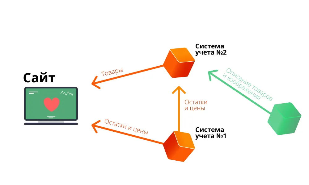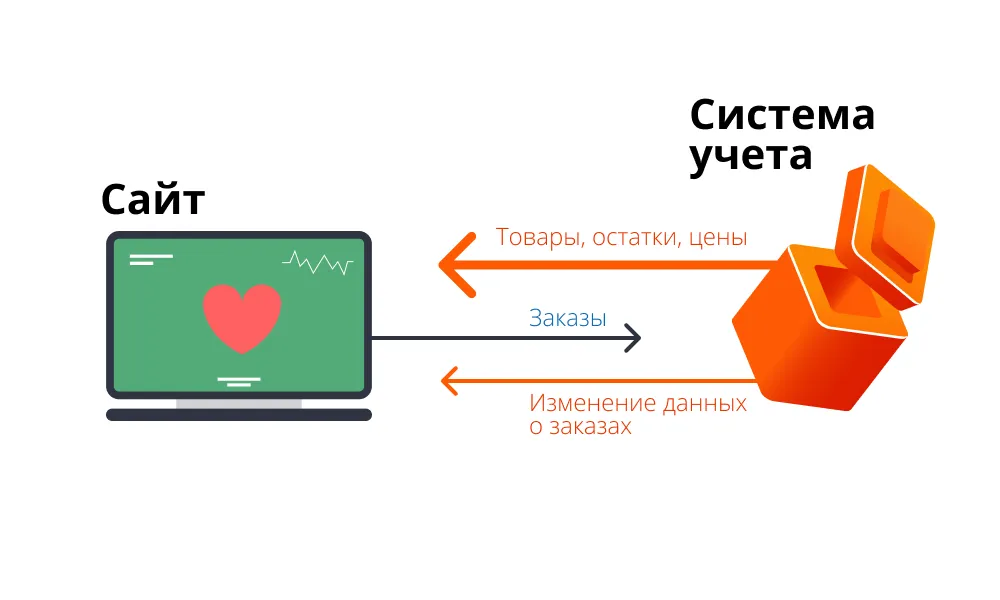 Из системы учёта на сайт отправляется информация о товарах, для торговых предложений — остатки и цены. С сайта в систему учёта — информация о совершенных заказах; обратно — «отклик» магазина о заказах: смена статусов.