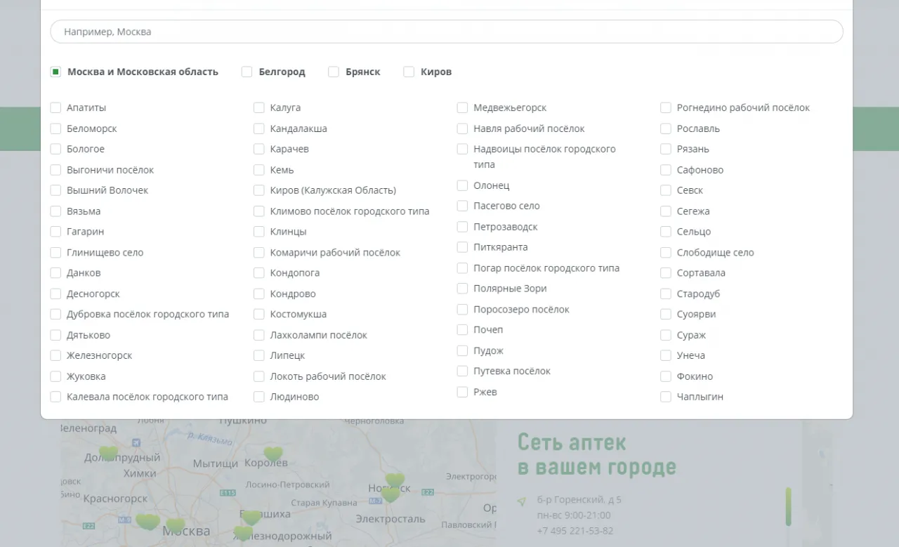Когда заказчик к нам обратился, не существовало никакой основы для будущего магазина. Была разрозненная группа региональнальных корпоративных сайтов без каталога. Отдельно для Карелии, отдельно для Москвы, Московской области, Брянска и так далее. При этом сеть является федеральной и одной из крупнейших по данным alpharm.ru.