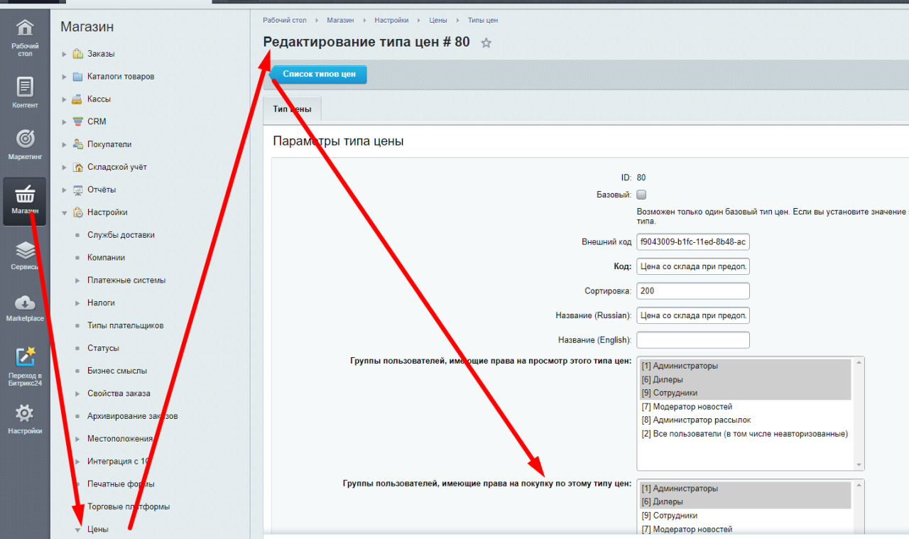 Каждому типу цен обязательно привязываются группы пользователей, которые могут покупать по этим условиям.