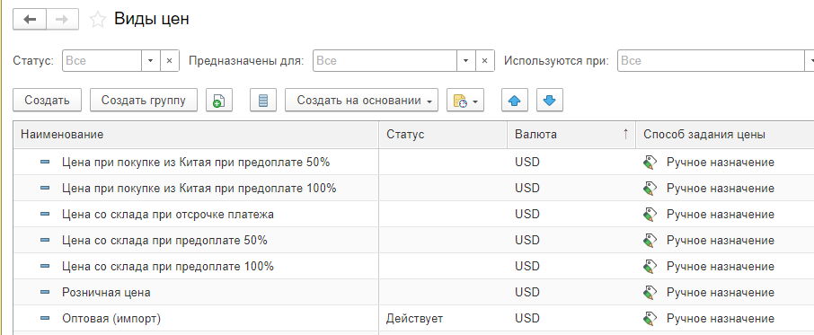 Создание видов цен в 1С