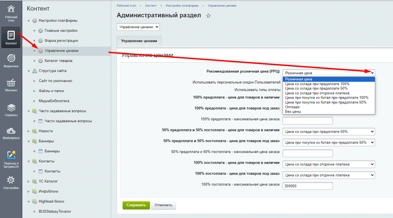 Редактирование типов цен на b2b-платформе