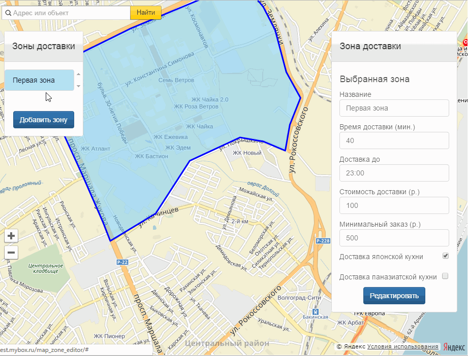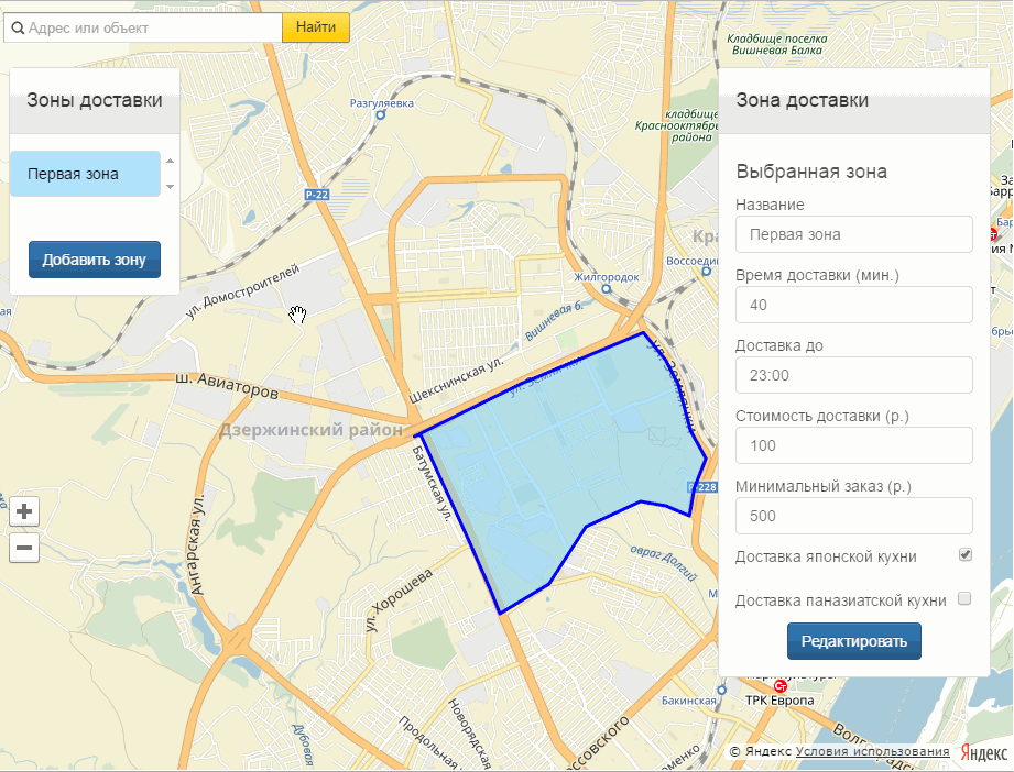 Теперь каждый клиент может узнать, какое меню действует в его районе города. На карте отображаются районы доставки японской, паназиатской кухни, а также римской пиццы. В зависимости от суммы и района, указанного пользователем система считает платную или бесплатную доставку при оформлении заказа.