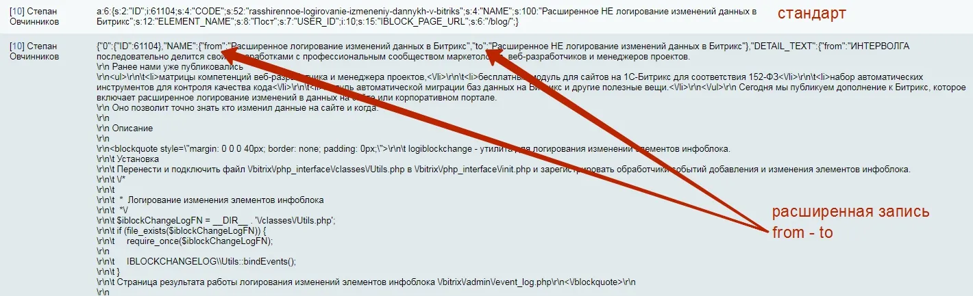 Вы видите сразу две записи — стандартную Битриксовую и нашу расширенную.