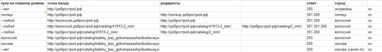 В итоге сценарии редиректов получились весьма разнообразные, была составлена специальная таблица для тестирования, по которой проверялась работа редиректов после каждой последующей правки.