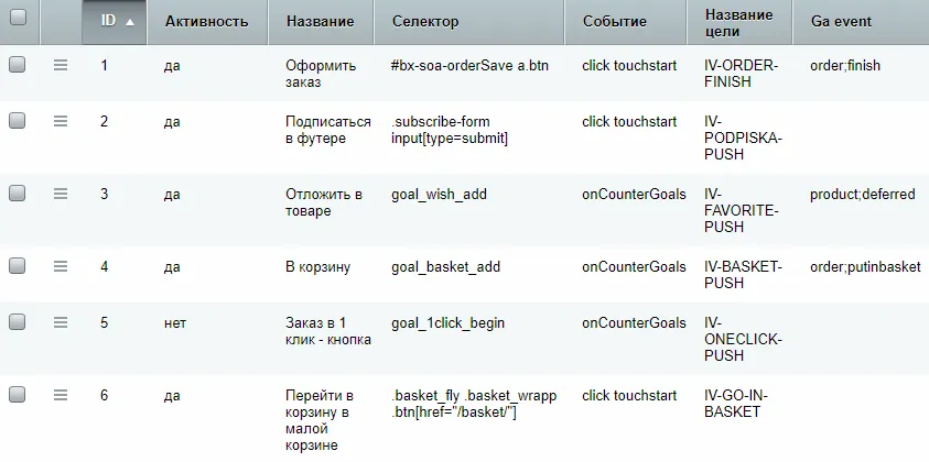 Для прочих целей мы создали таблицу в административной части, где можно в одном месте задавать названия целей для Метрики и Аналитики, указывать селекторы для кнопок или идентификаторы целей Аспро.