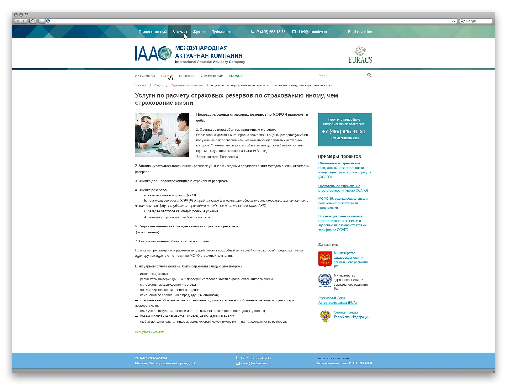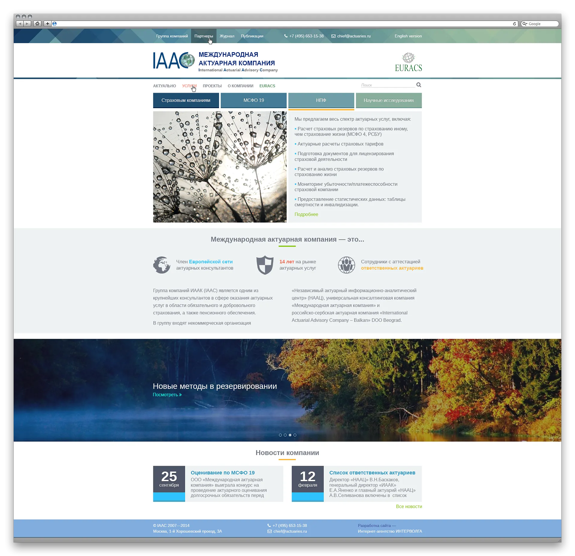 Консалтинговая компания IAAC одна из первых начала предоставлять подобного рода услуги в России. Помимо этого она входит в старейшую европейскую сеть, объединяющую независимые актуарные консалтинговые организации, а сотрудники входят в ведущую профессиональную ассоциацию - Гильдию актуариев.