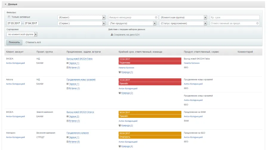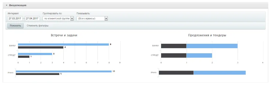Группировка позволяет оценить загруженность конкретного направления или отдела — к примеру, в банковской сфере перегруз по предложениям, задачам и встречам, а в фармакологии наоборот недобор. То же относится к группировке по сервису — руководитель поймёт, какой отдел тащит больше всего задач.