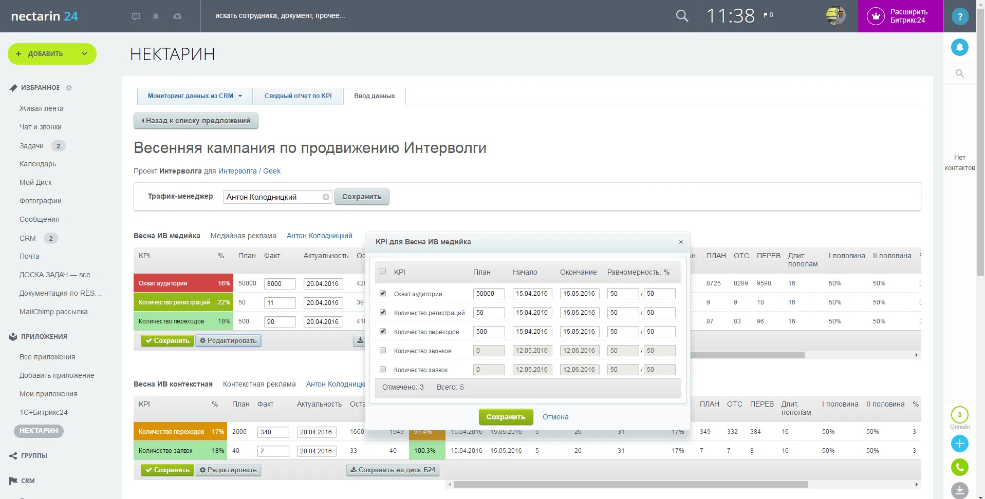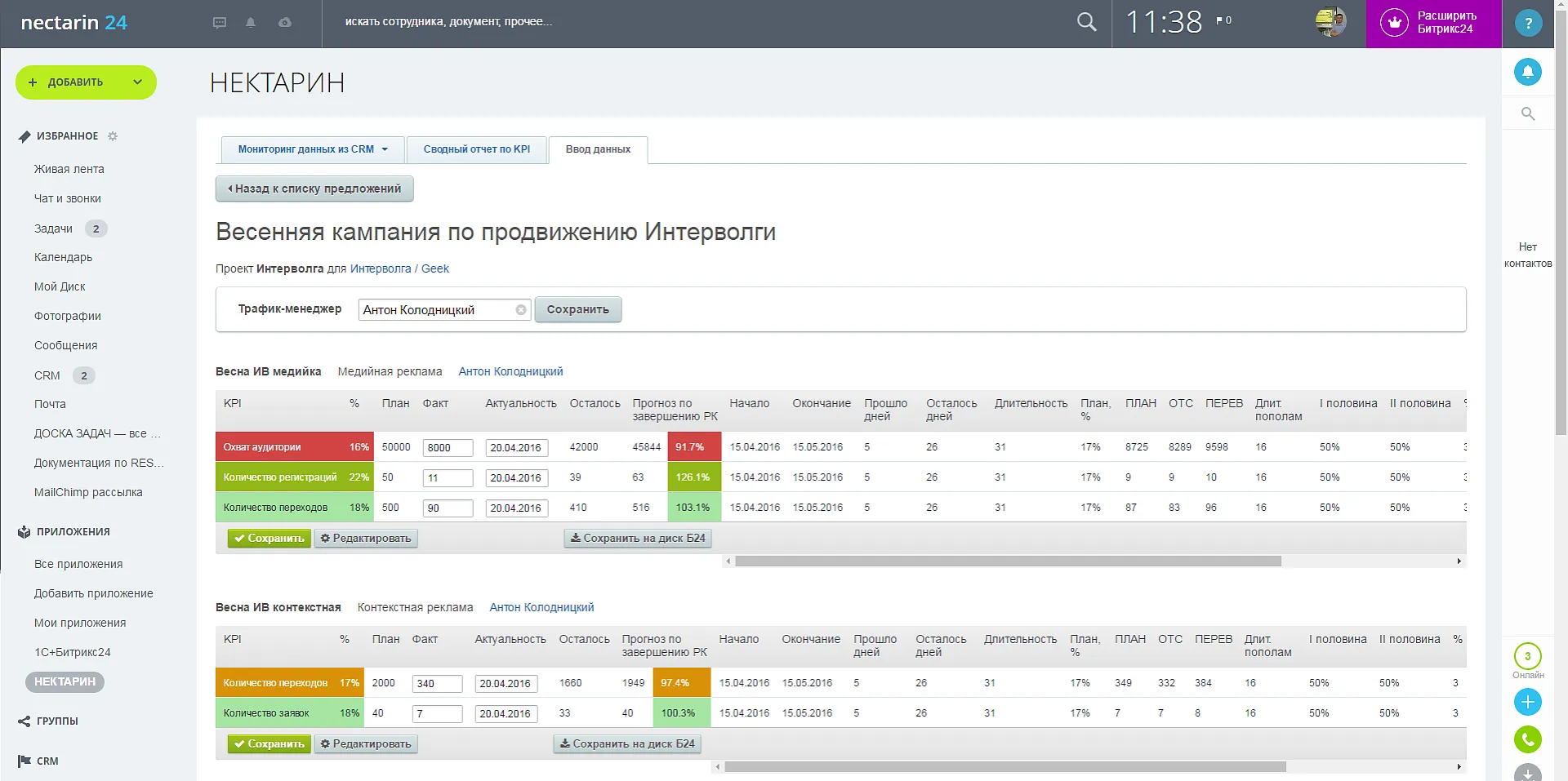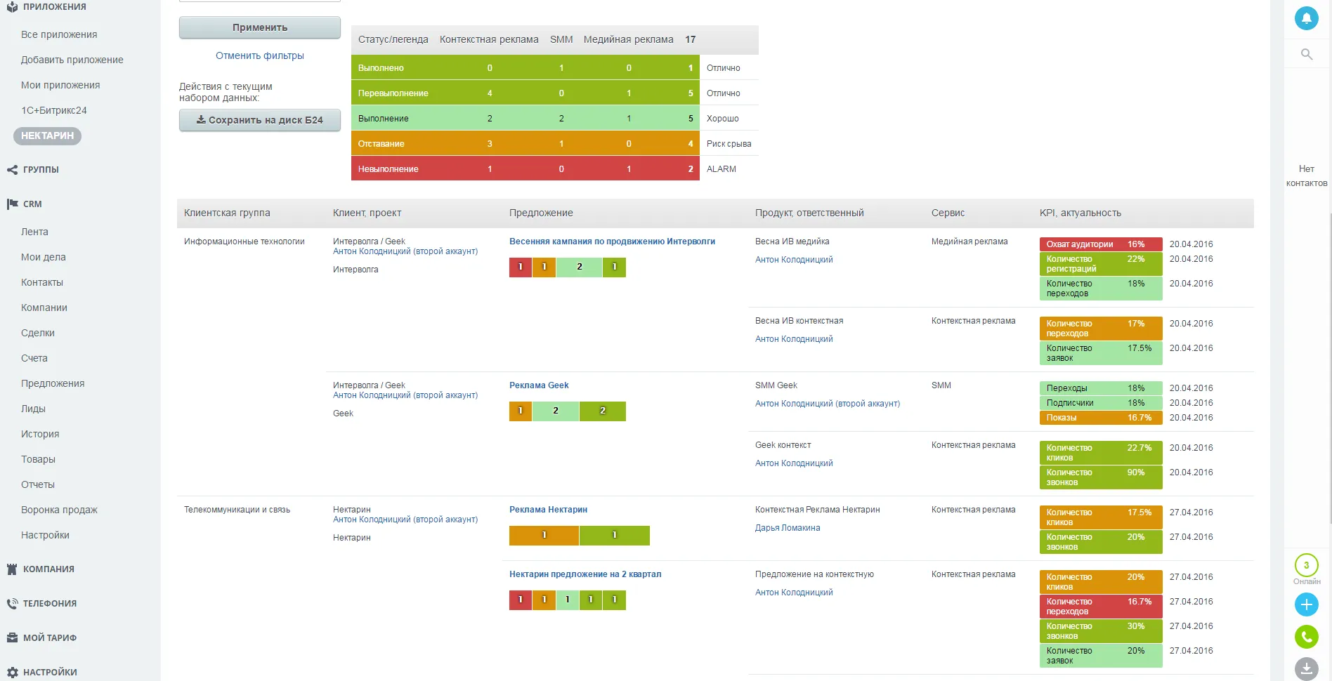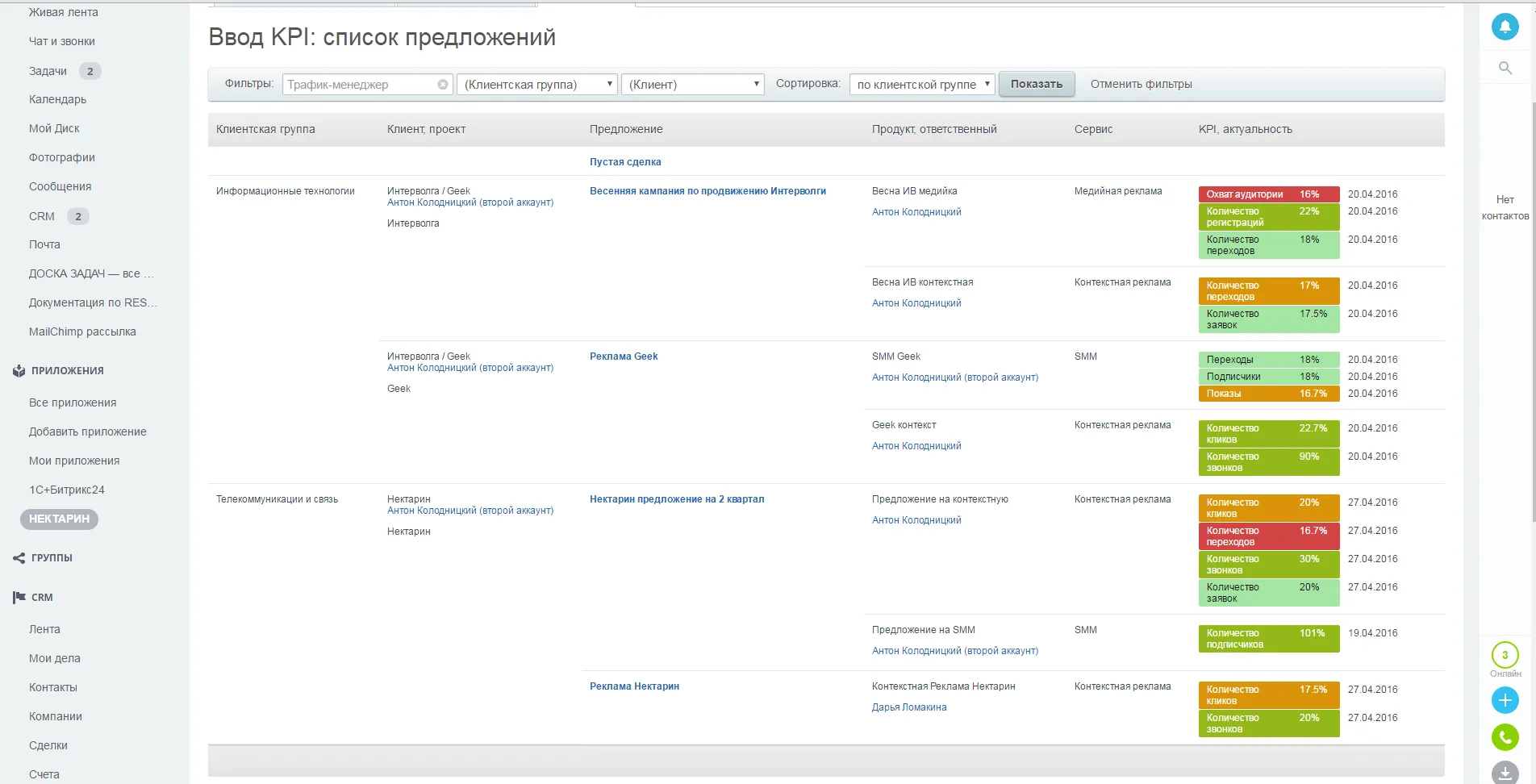 Вводит информацию и составляет отчёты специальный отдел трафик-менеджмента. Раньше сотрудникам приходилось создавать различные отчеты в excel, что занимало много времени. Теперь достаточно ввести данные, а дальше Битрикс24 построит отчёты и графики сам.Вернёмся к нашему отчёту по KPI, а точнее к нижней части страницы. Тут аккумулируются прогнозы по выполнению KPI всех продуктов, предложений и проектов.