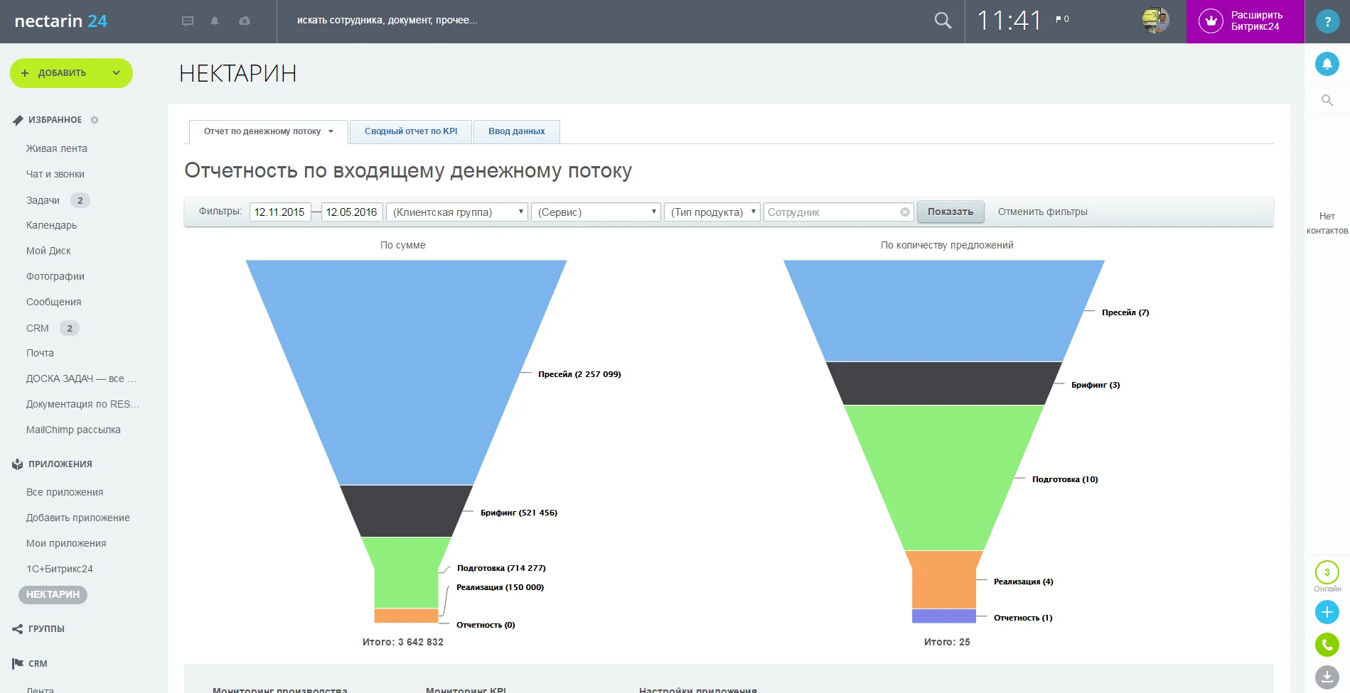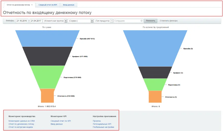 Битрикс24 показывает «воронки продаж», где можно посмотреть сколько сделок и на какую сумму находятся в разных статусах.Мы реализовали отдельный специальный отчёт с дополнительными возможностями — фильтрация по клиентской группе, сервису, продукту и даже сотруднику. Это поможет выявить узкое место. При создании не забыли и о красивом внешнем виде. Для формирования воронок (и других графиков) встроили внешнюю библиотеку диаграмм highcharts.