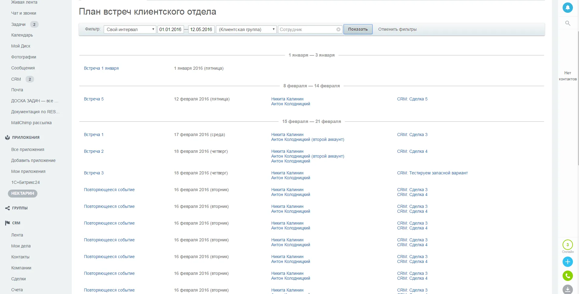 Сравнительно простой и неброский отчёт, показывающий в кратком виде какие встречи прошли или планируются. Данные сгруппированы по неделям.Можно отфильтровать по клиентской группе или сотруднику — сразу понятно, кто не любит кататься по пробкам.:)