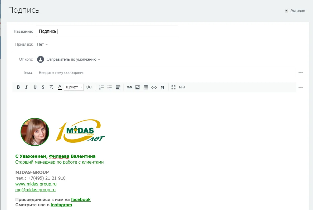 3. Настройка почты. Подключена корпоративная почта и личный ящик для каждого менеджера. Теперь менеджеры высылают письма прямо из карточки b2b клиента. Для удобства настроены подписи в письмах с использованием шаблонов: