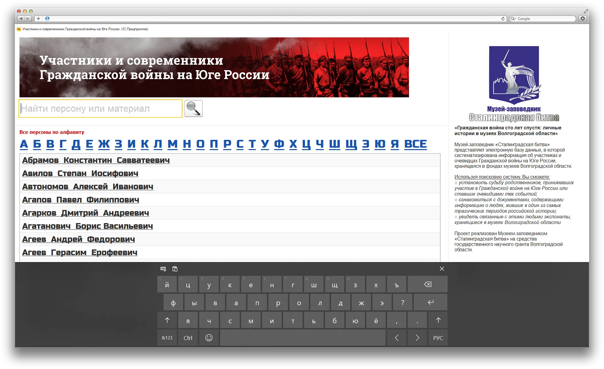 Посетители музея должны иметь возможность осуществлять поиск информации по персоналиям, знакомиться с информационно-справочной информацией, графическим отображением хранящихся в музеях документов и экспонатов, отражающих события периода Гражданской войны.В связи с этим в режиме «интерактивного киоска» - то есть в планшетном режиме необходимо было решить задачу с выводом сенсорной клавиатуры и взаимодействием с ней поиска по архиву.