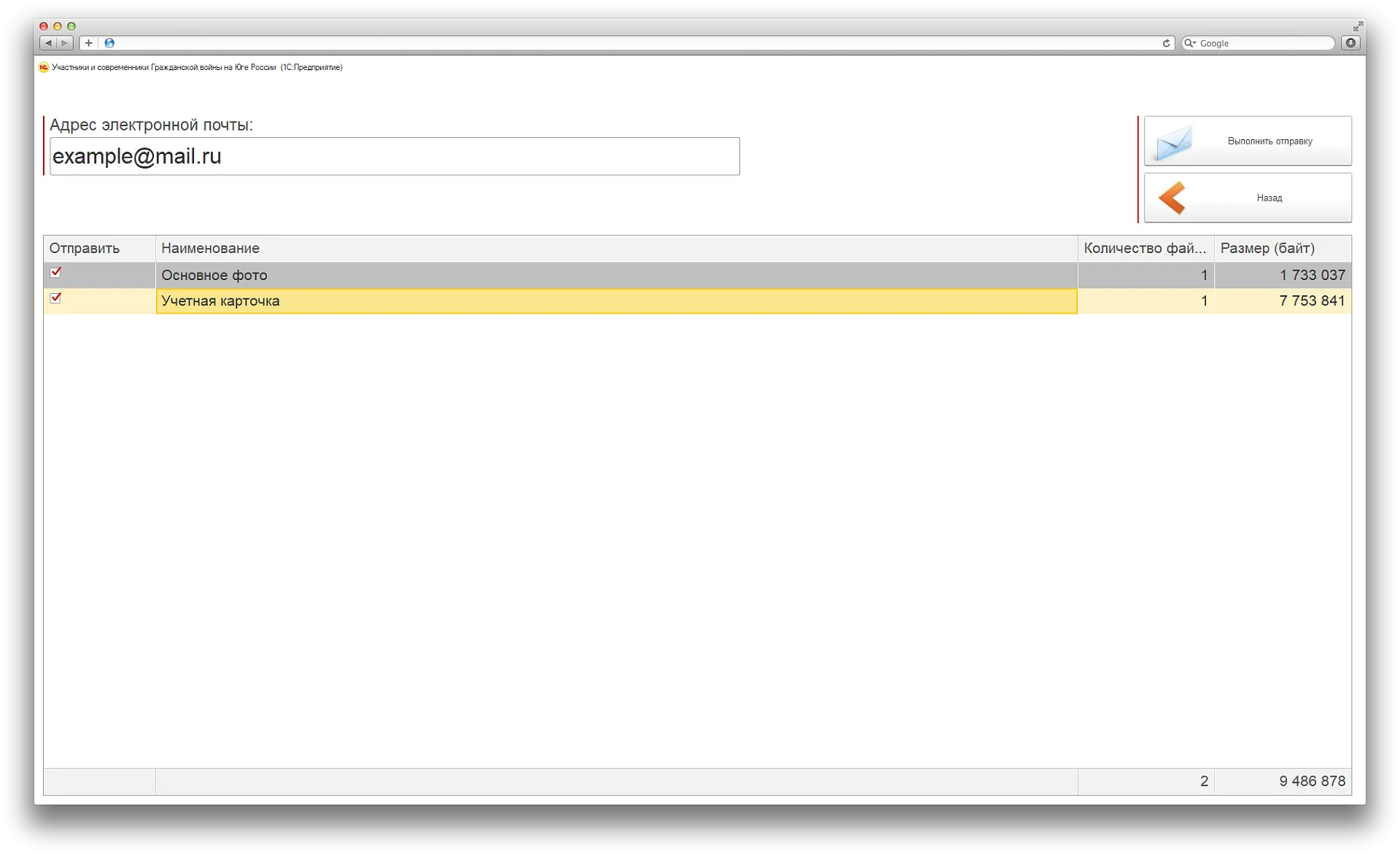 Специалисты ИНТЕРВОЛГИ решили эту задачу с помощью библиотеки стандартных подсистем и возможности выбора необходимых для отправки файлов из карточки участника войны.