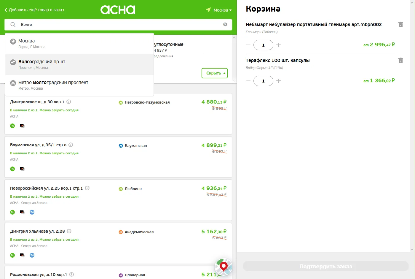 - Переработка поиска аптек в корзине (поиск аптек неподалёку, учёт ошибок в написании адреса или названия аптеки);