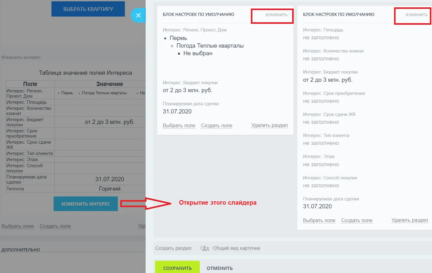 Таблица в карточке сделки и слайдер для заполнения