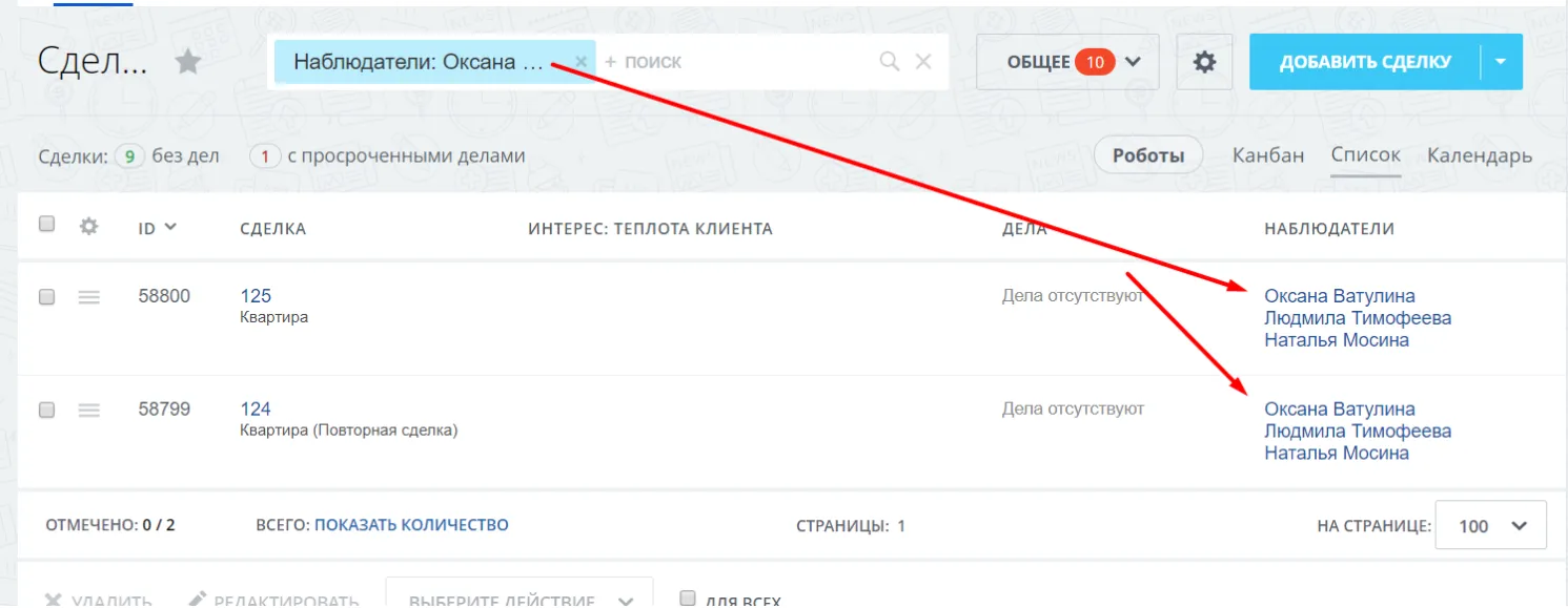 Возникают ситуации, когда сделку ведут несколько менеджеров отдела продаж. Так как в сделке не предусмотрено множественное значение для поля ответственный, то сотрудники используют механизм "наблюдателей". Однако для наблюдателя отсутствуют инструменты для работы со сделками.Первое улучшение, которое было сделано, — отбор сделок по наблюдателям в фильтре. К сожалению, по штатному полю "Наблюдатель" фильтровать сделки нельзя. Поэтому мы сделали функцию для поиска сделок по наблюдателям: