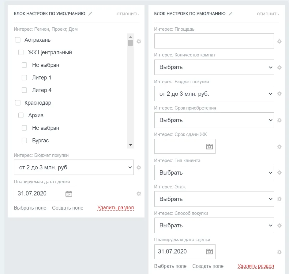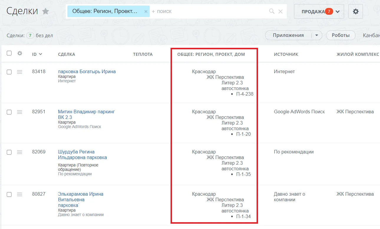 В сделке созданы четыре поля, часть из которых интегрирована с внешней базой объектов строительства. Не мы их делали, но нам пришлось дорабатывать функционал для удобства работы менеджеров. Поля напрямую или косвенно содержат информацию об объекте строительства:- Квартира — поле, в которое передается информация из внешней БД:
