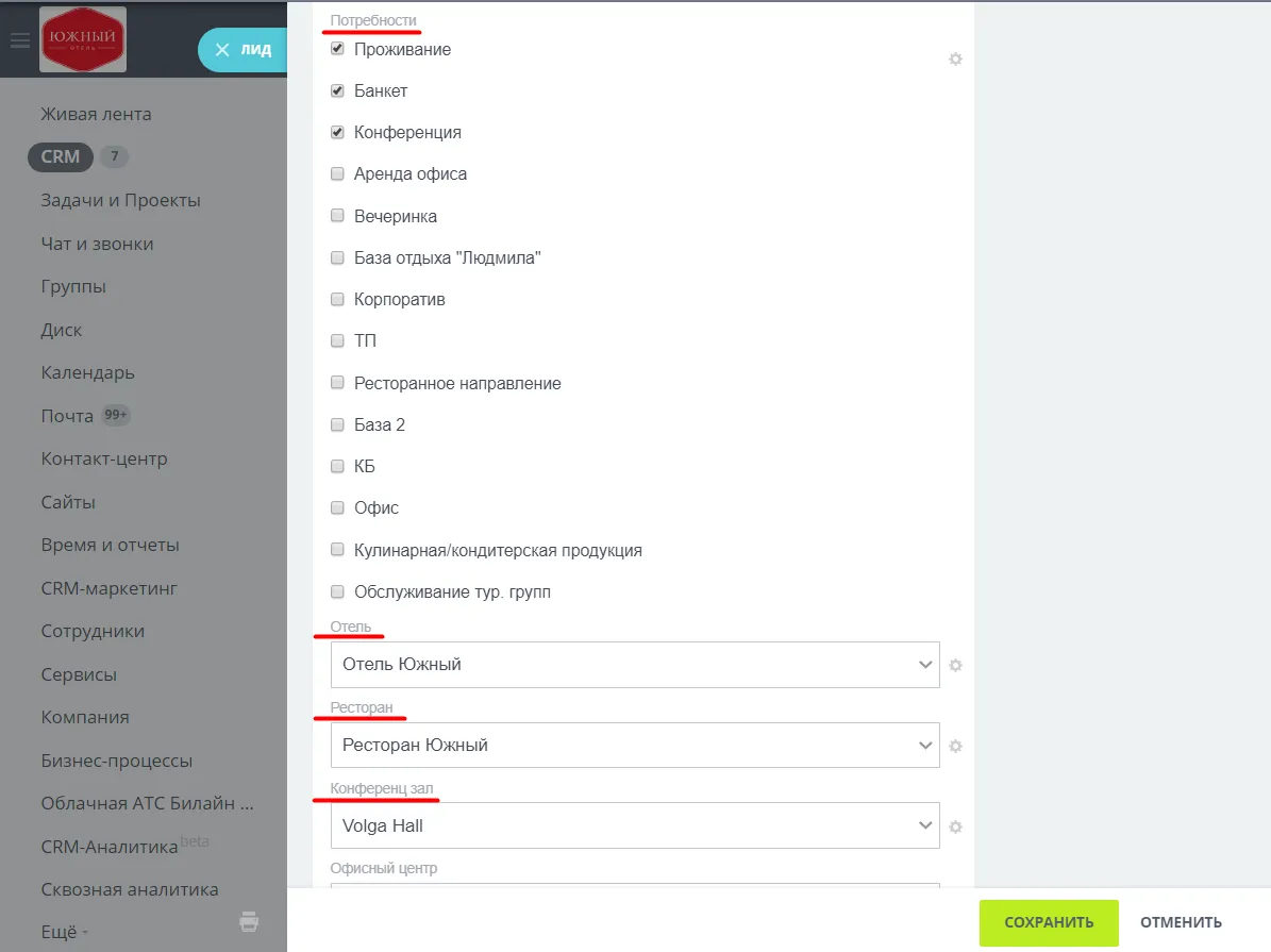 Если клиент подтверждает обращение, то лид конвертируется в сделку. При этом есть разные варианты. Если вдруг требовалось только проживание группы, то выбирается направление «Проживание в гостинице». Если банкет, то выбирается направление «Банкет в ресторане». В нашем случае выбирается «Комплексная услуга»: