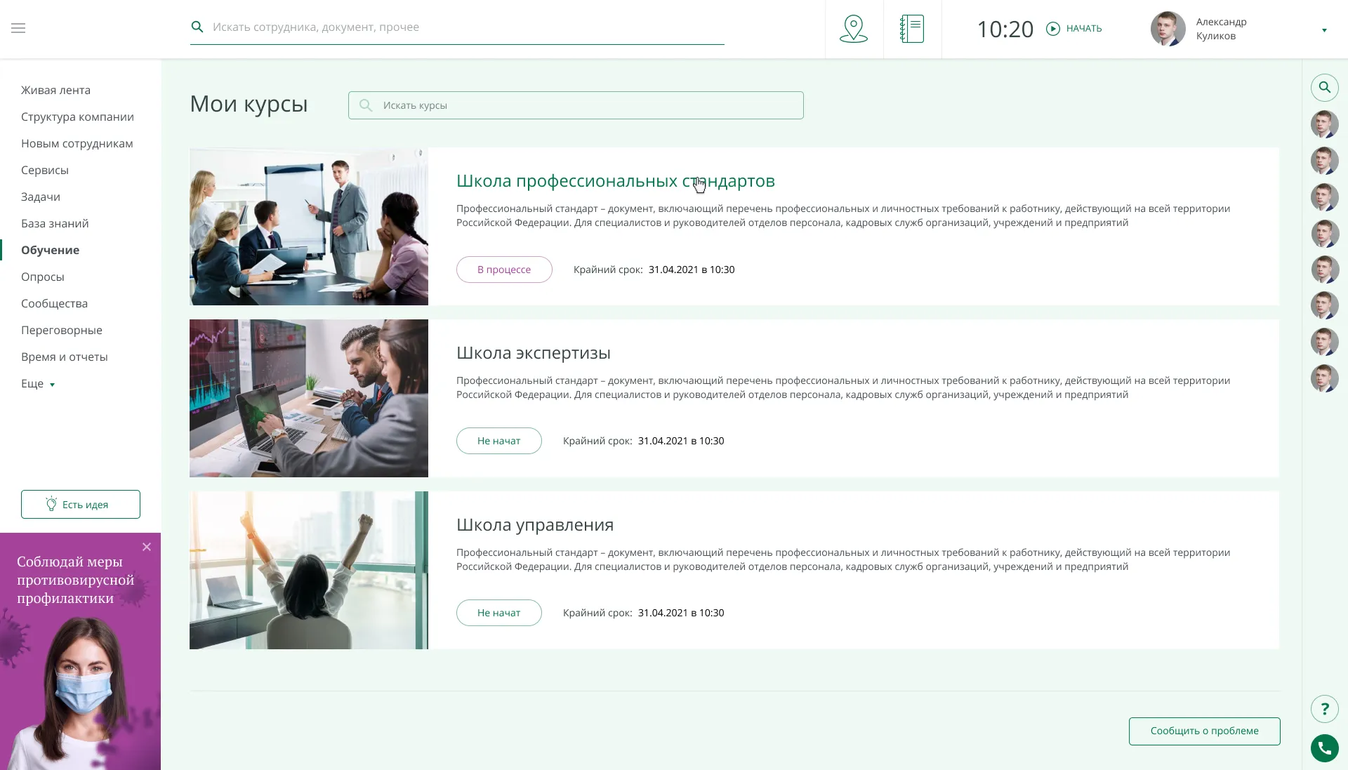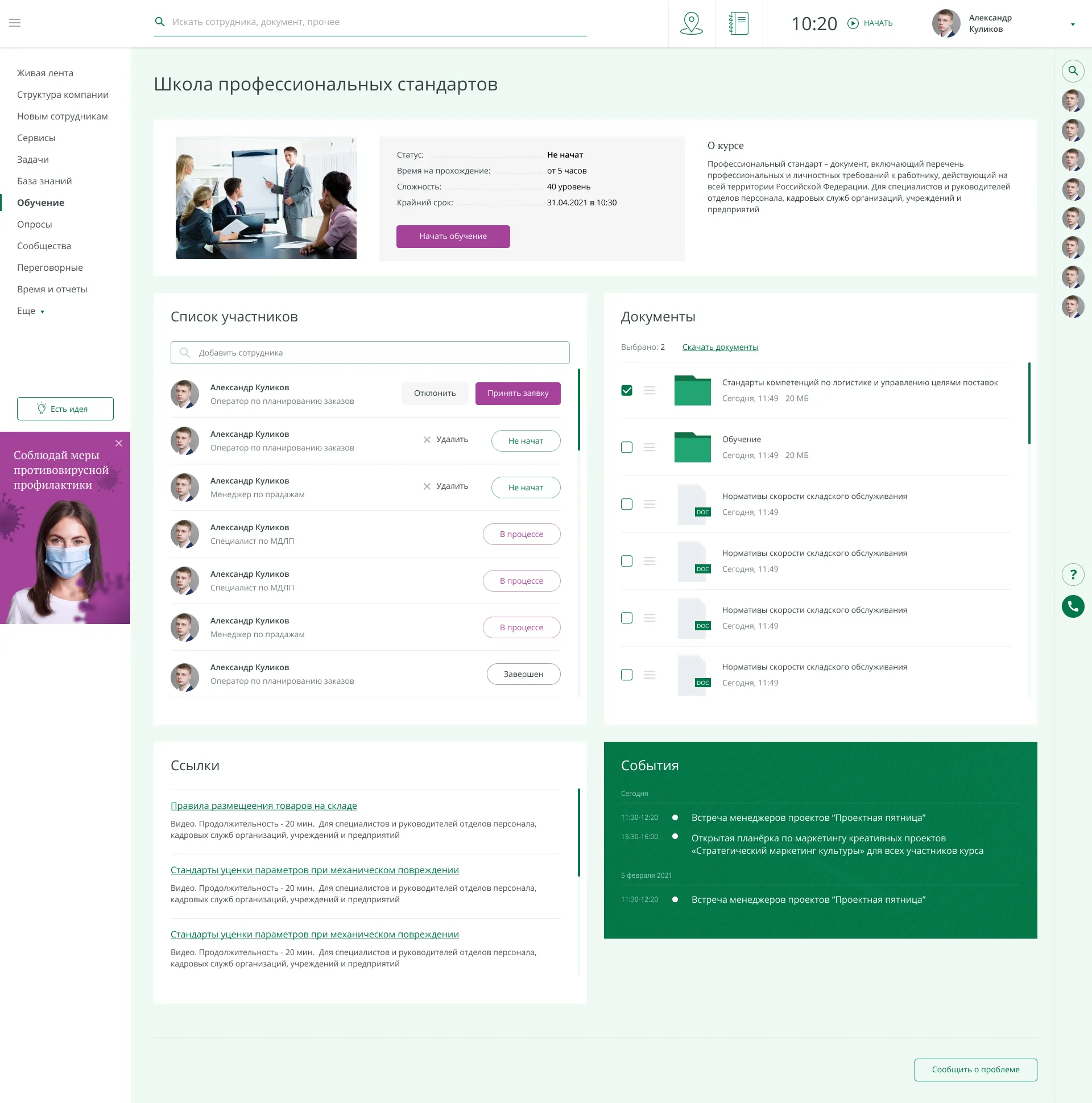 • Синхронизация бронирования переговорок с новым и существующим порталами. Обучающие курсы для сотрудников. Сотрудник может отправить заявку на нужный курс, после получения доступа в курсе отображаются прикрепленные документы и полезные ссылки. Для каждого курса есть свой календарь событий, при добавлении на курс сотрудник становится участником всех событий этого курса. Документы курса подтягиваются с диска Битрикс24. После прохождения тестирования либо аттестации автоматически генерируется сертификат о завершении курса. Запросы о прохождении курса и аттестации приходят уполномоченным сотрудникам;