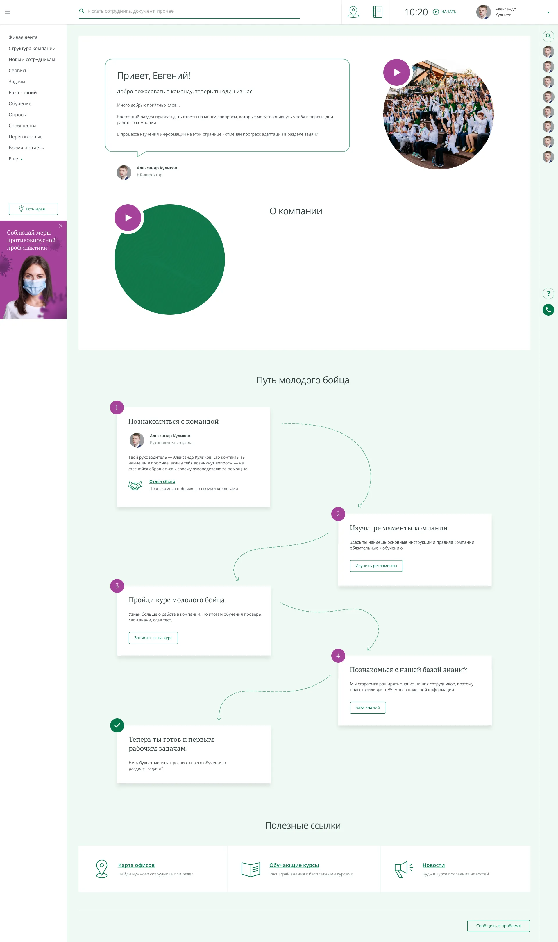 • «Путь молодого бойца» — страница для нового сотрудника. Знакомство с компанией состоит из поэтапного чек-листа: знакомство с генеральным директором, приветственные видео о компании, изучение регламентов компании, прохождение курса молодого бойца (проверка знаний о компании), знакомство с базой знаний, полезные ссылки (карта офисов, обучающие курсы, новости).