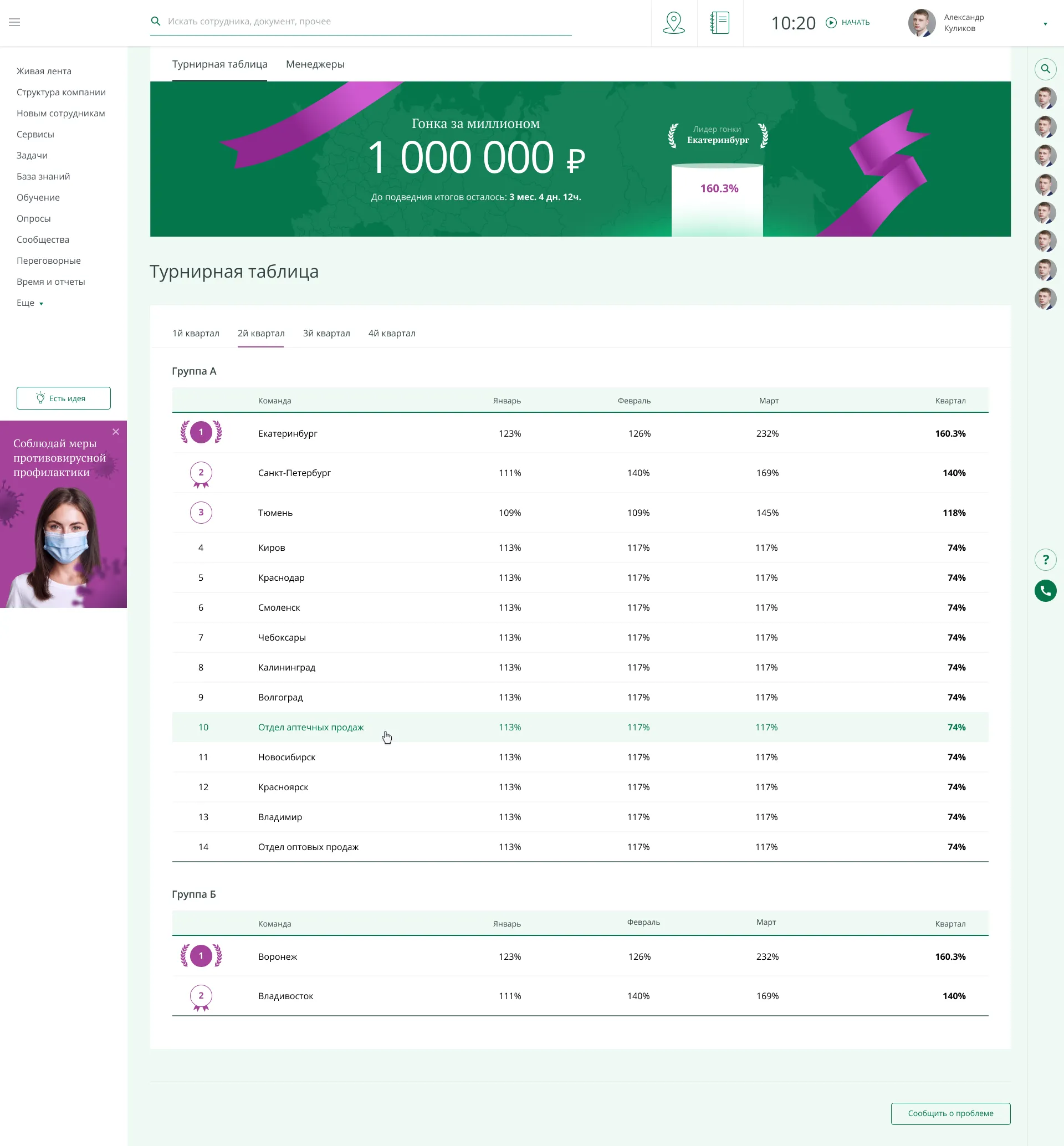 • «Гонка за миллионом»: вёрстка и дизайн турнирной таблицы, где сотрудники отслеживают проценты продаж по регионам и личные достижения, поддерживая соревновательный дух;